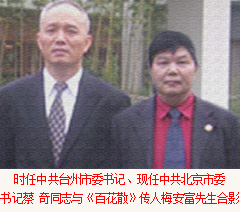 全國政協副主席、中共中央委員、中國殘聯主席鄧樸方先生與鄭州臺州商會支部書記兼秘書長、《百花散》傳人梅安富先生親切交談鄭州市腫瘤康復協會名譽會長。2005年5月,作為臺州古代中醫秘方梅氏《百花散》